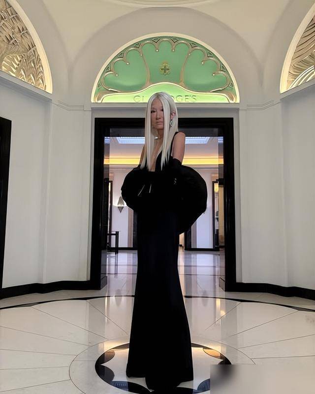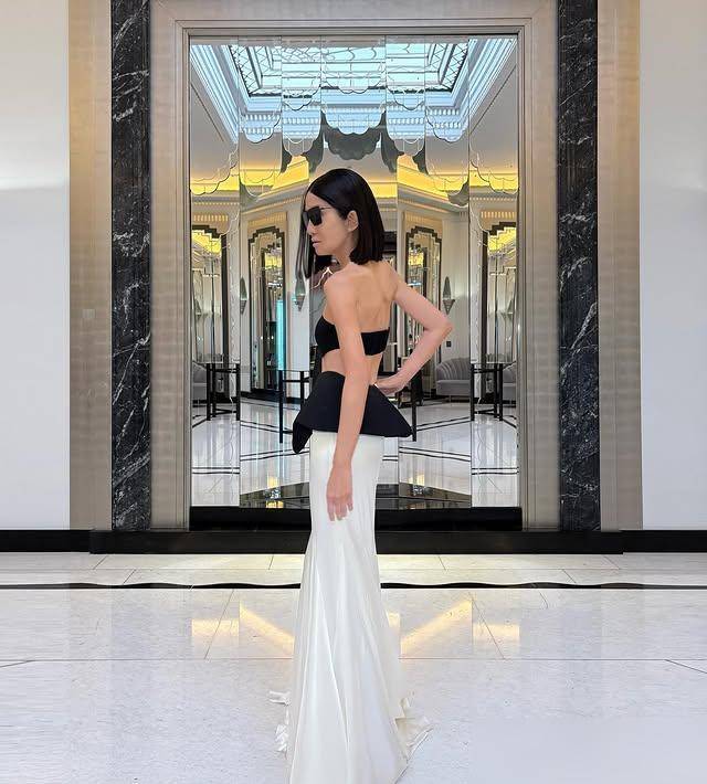 全身仅黑白两色,但通过不同材质营造出层次——抹胸部分采用哑光厚缎面,裙摆换成带光泽感的丝绸,就连配饰都保持同色系。